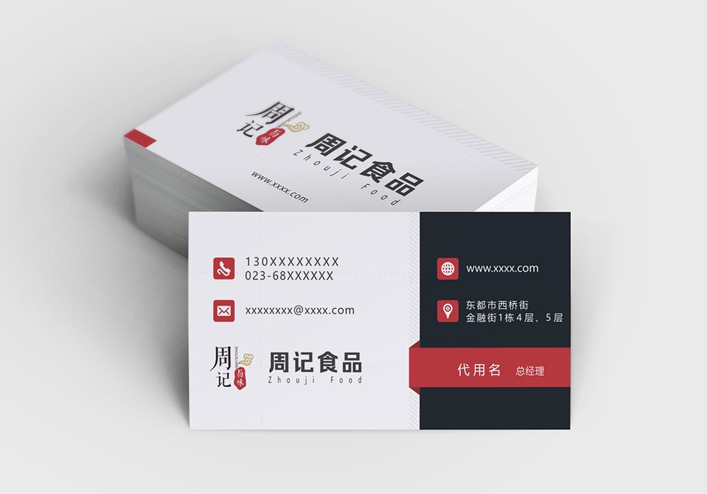 周记食品企业名片,通过形象的表现技巧,塑造出艺术形象吸引受众接受宣传的主题,设计主题重点突出,视觉效果凸显。信息传达清晰明确,文化内涵延伸充分,给受众留以丰富的想象空间,根据行业特性开展创意设计,更好的体现文化理念以及品牌故事,加深受众的总体印象。将企业的战略目标融合入企业精神文化内涵中,通过图形化的表达方式充分表现,创意新颖独特,表现张力充分,受众观后印象深刻,记忆效果强。后期印刷制作时精美,更吸引受众的注意力。